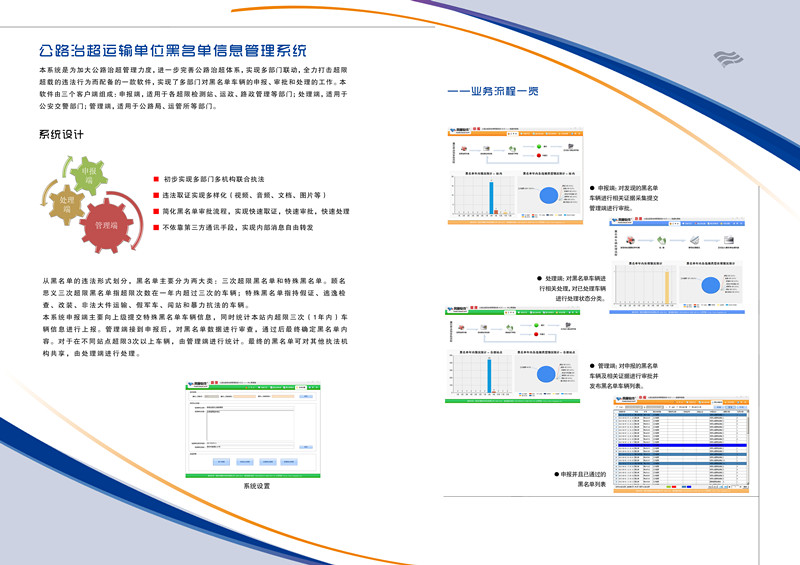 大件超限运输车辆许可“黑名单”管理系统具有三个特点:一是自动生成许可车辆数据列表,将“黑名单”车辆全部纳入办证监控系统。二是有力保证纳入“黑名单”车辆、提供虚假申请资料运输企业、提供虚假产品资料的生产企业及申请经办人惩治措施实施到位;三是自动完成55吨以下、55—120吨、120吨以上及监护车辆等数据统计。