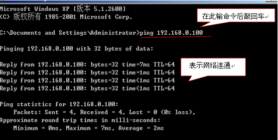 (1) Ping命令可以检查网络是否连接正常。格式为Ping(带空格)指定 IP地址,如数据服务器ip为192.168.0.3,就输入ping 192.168.0.3然后回车。如图,如果我们要判断IP地址为192.168.0.100的服务器是否打开,我们可以用Ping命令来实现这个功能。如下图